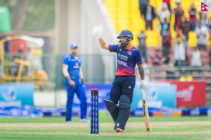 ओपनर कुशल भुर्तेल २४, आसिफ शेख ७, भीम सार्की १०, कप्तान रोहित पौडेल २, बसिर अहमद २०, आरिफ शेख १५, सोमपाल कामी १५ र करण केसी २२ रनमा आउट भए । ललित राजवंशी शून्यमा अविजित रहे ।